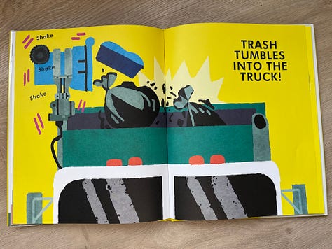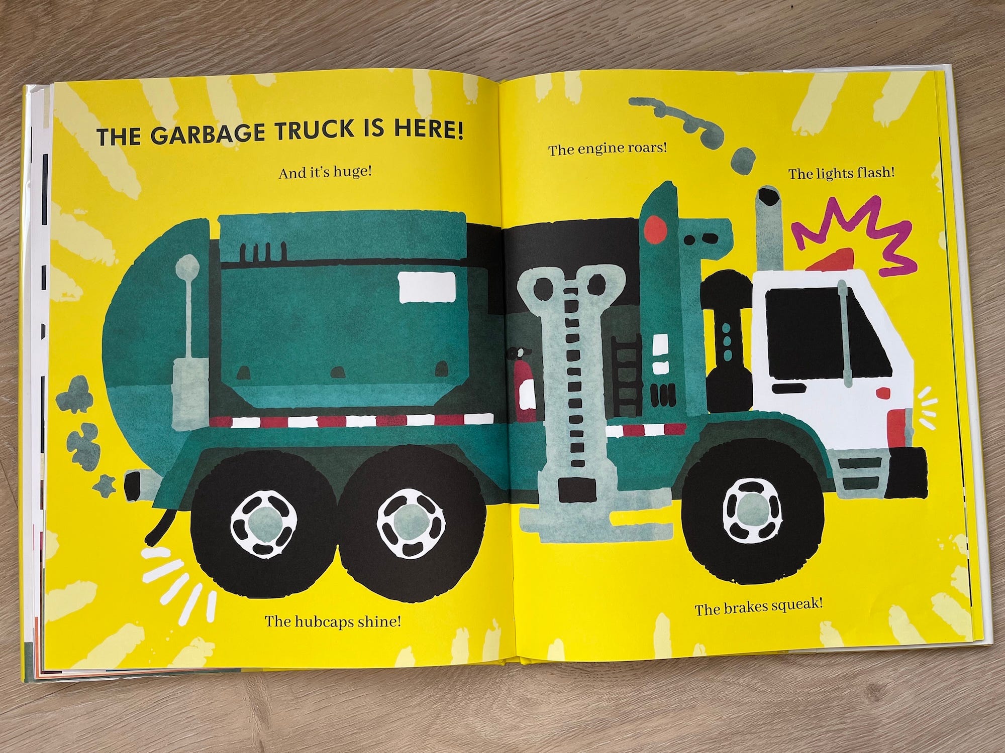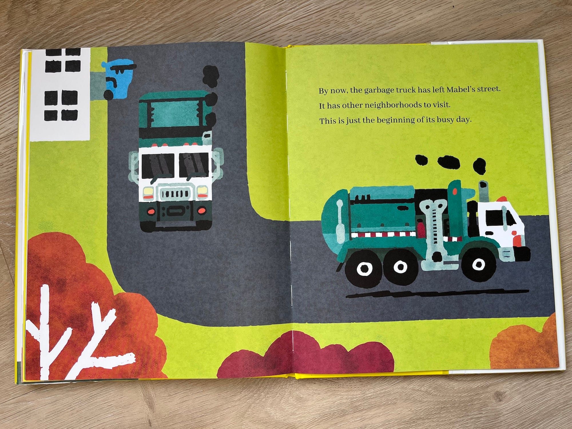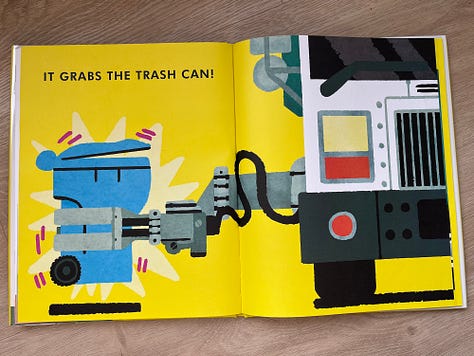 Over the next three spreads, what was once mundane becomes magical as the garbage truck does its job.