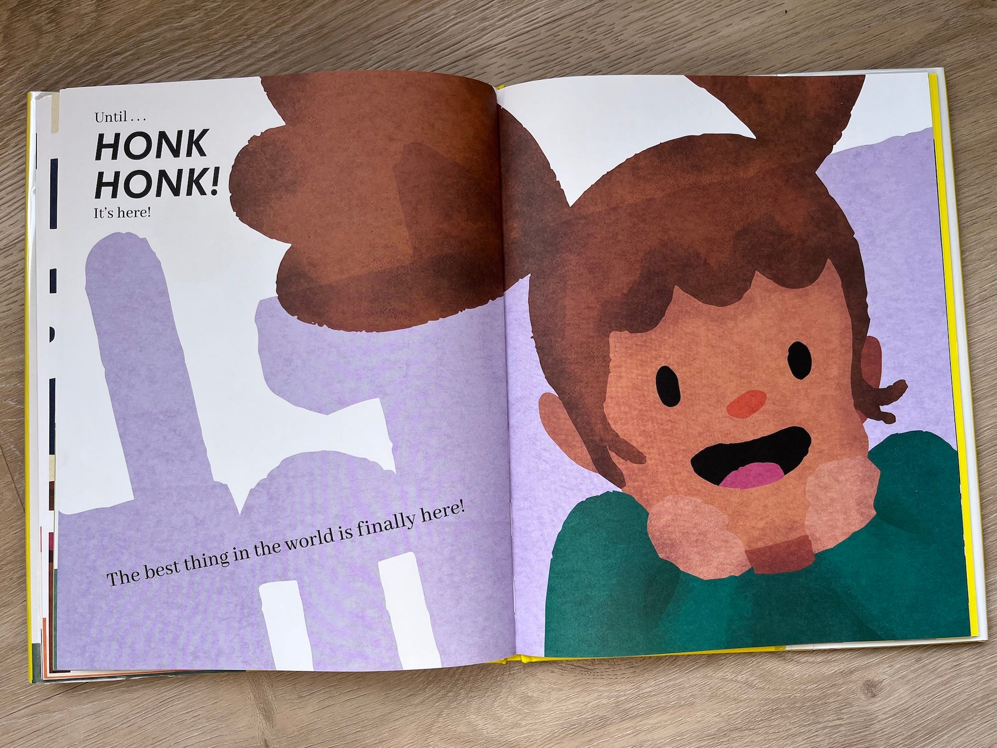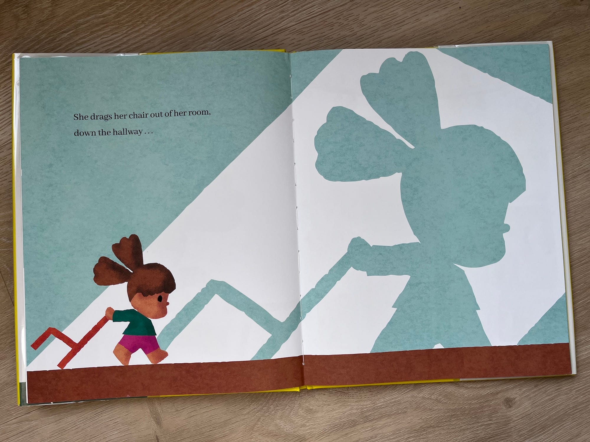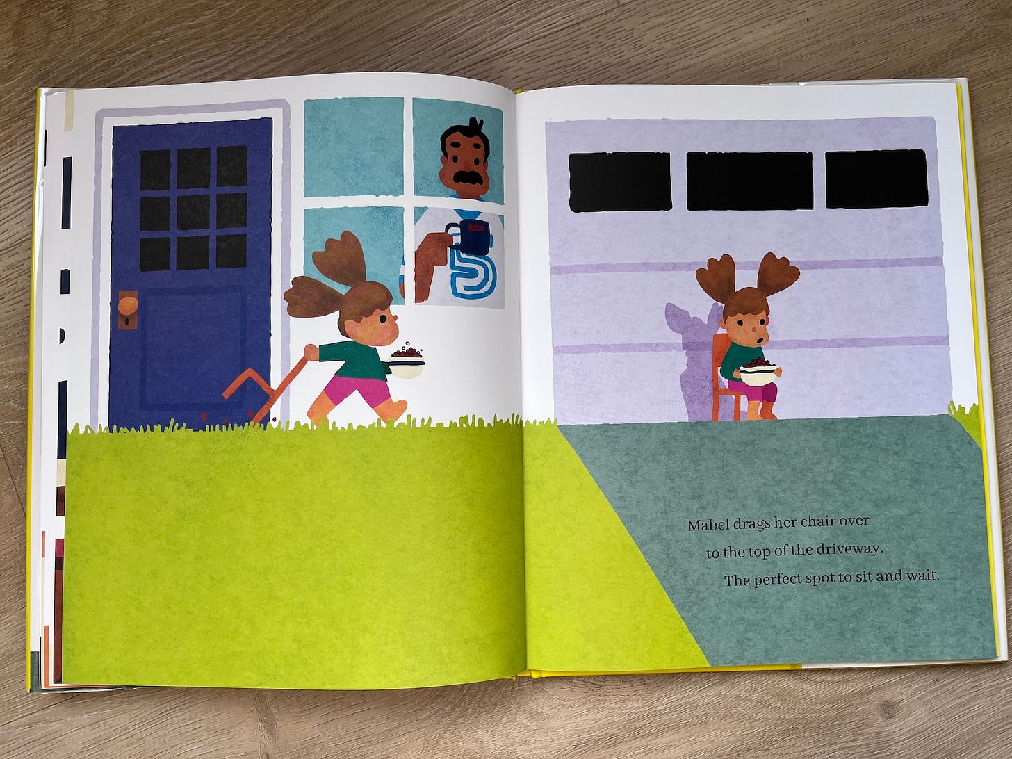 Whatever Mabel is waiting for has almost arrived and she’s giddy. The shadow is angled, which as Molly Bang explains in her visual literacy bible PICTURE THIS, wordlessly implies motion or tension. The shadow is also more detailed now, allowing readers to predict what Mabel has been waiting for (“Excellence of presentation in recognition of a child audience”, anyone?).