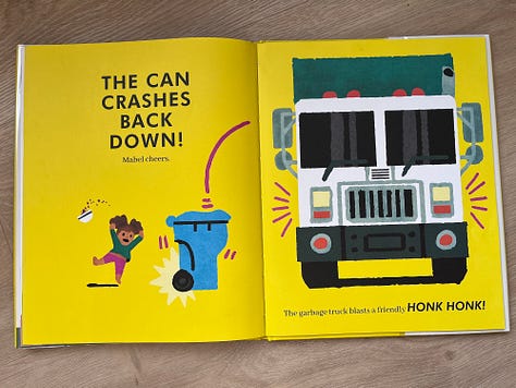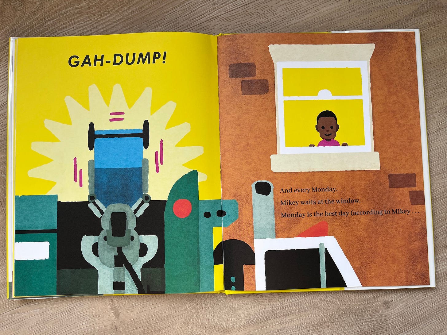 The yellow returns (but only on half of the spread so as to not overshadow Mabel’s big moment earlier in the book) - Mabel isn’t the only one who’s excited to see the garbage truck. The yellow also appears inside Mikey’s window.