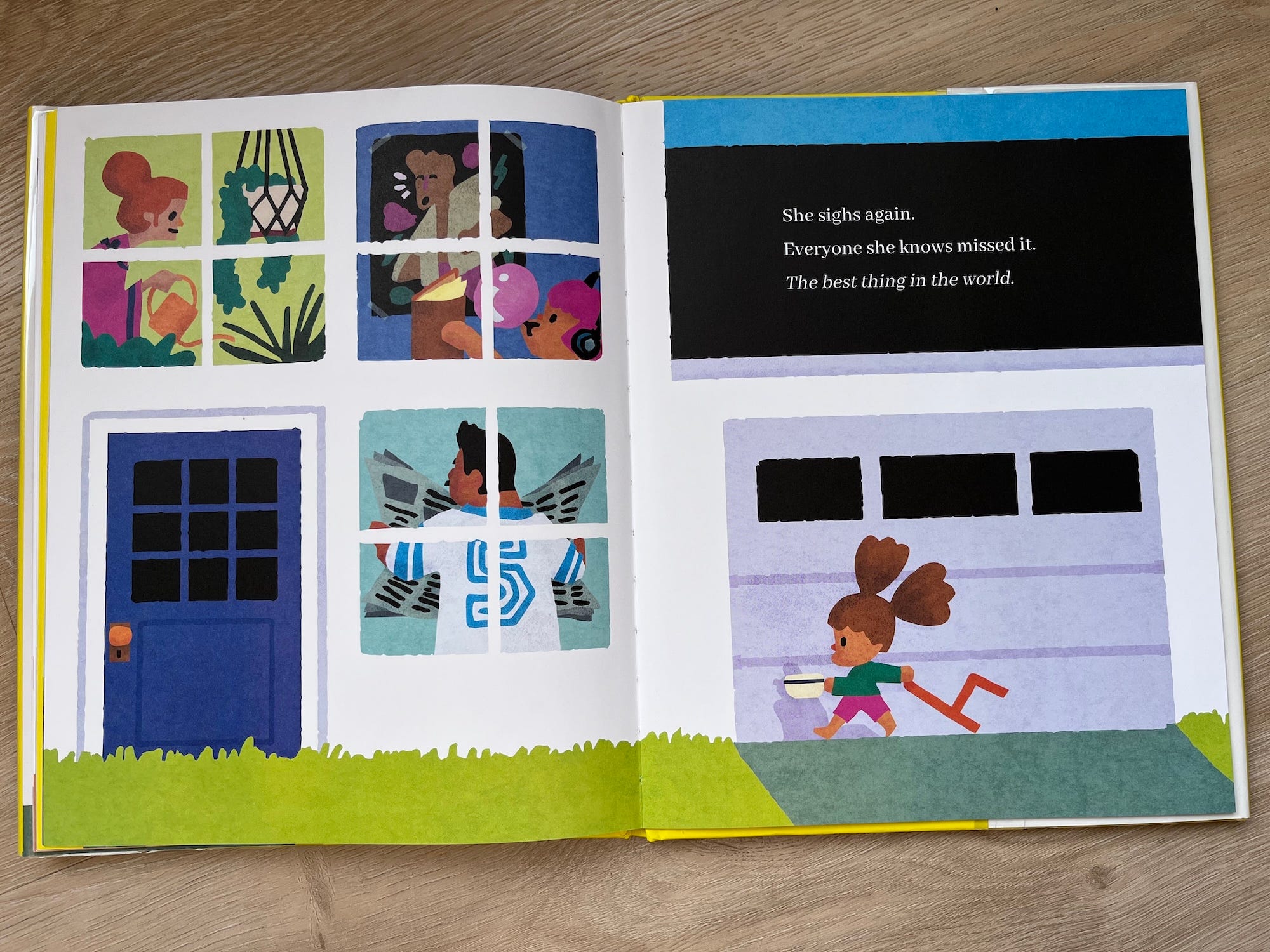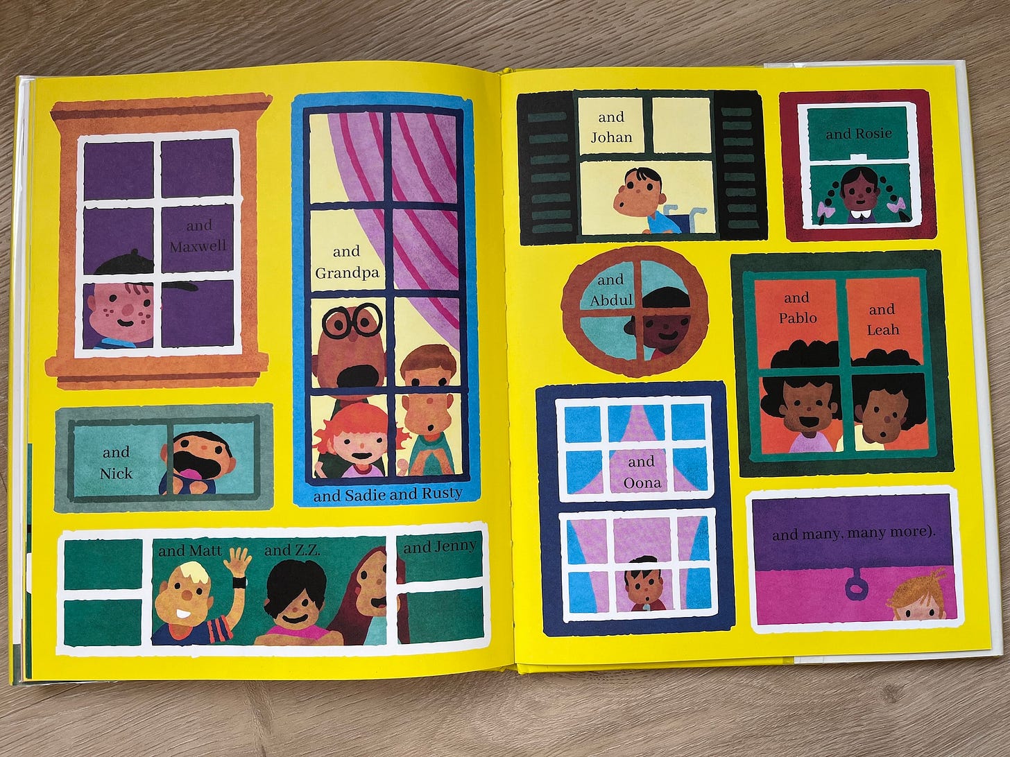 Mabel (and Mikey) are not alone. Although it’s presented as a sort of picture frame wall, we instantly understand that these kids are looking out their windows all over the city. What color is the background? Yep - that same yellow, wordlessly reminding you of what everyone is looking at.