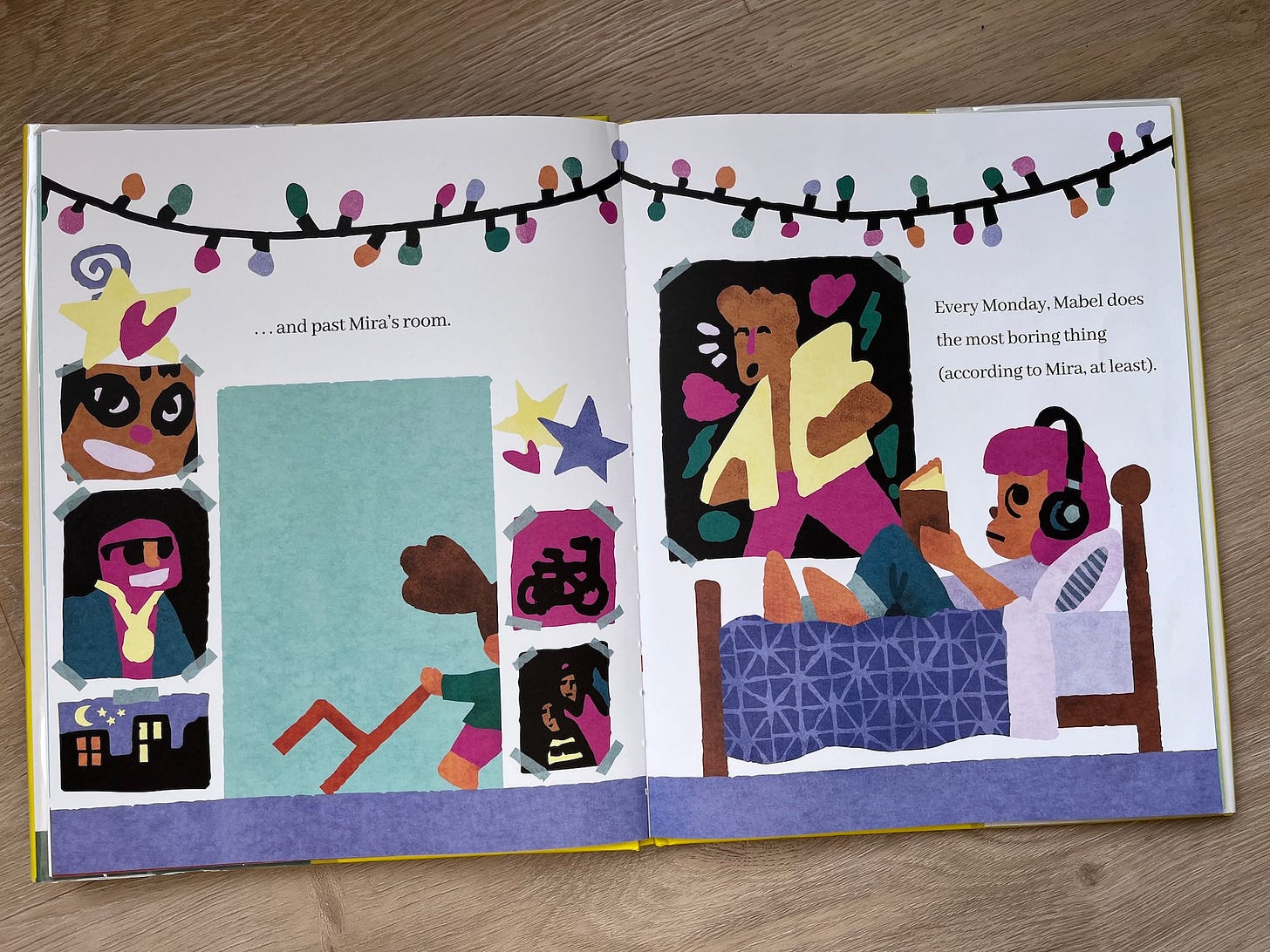 We see Mabel pass big sister Mira’s room. Mira’s eye roll visually expands on the text - she doesn’t have to say a word.