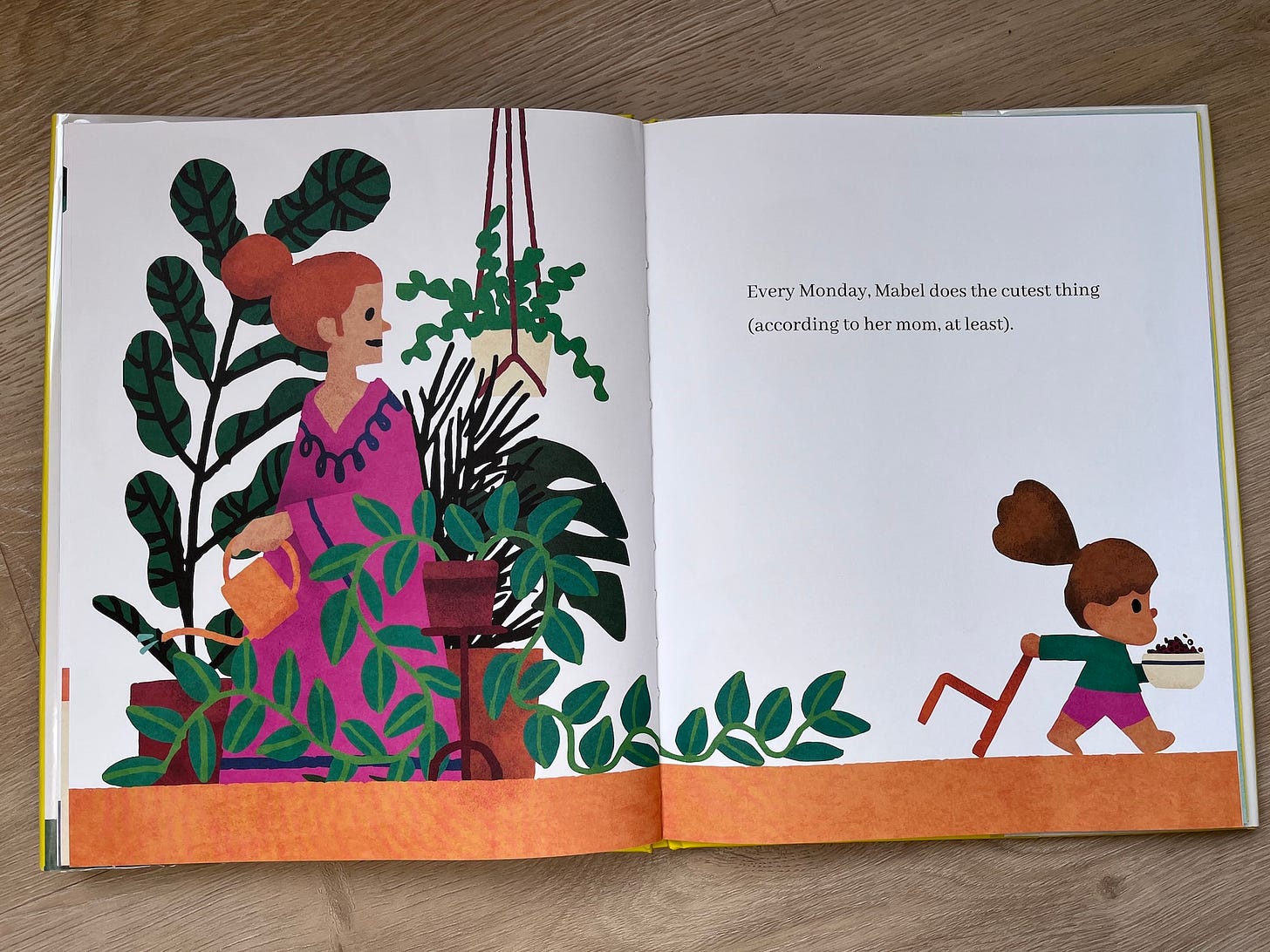 Even though we only see her hand, we already have a sense of the mom: she is a plant lover and nurturer (as we see her watering/caring for her plant).