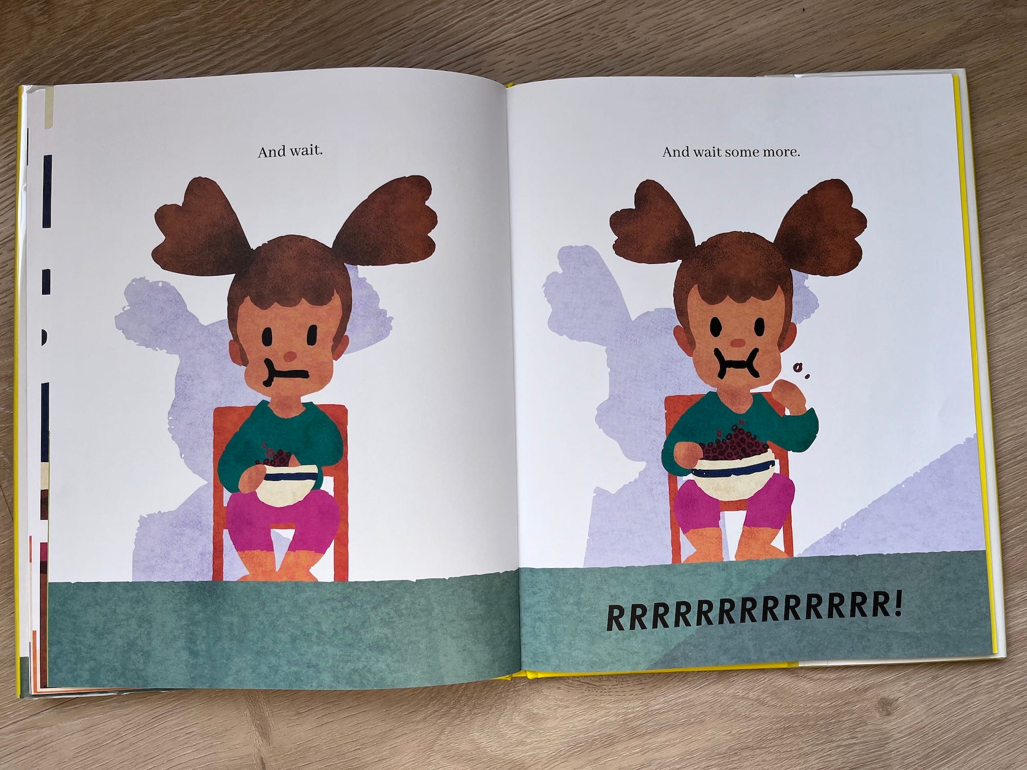 The left side of the spread is crammed with flora, contrasting the “lone wolf” status of Mabel on the right. We get a sense of Mabel’s determination, as she keeps marching with that chair while holding a bowl of dry cereal.