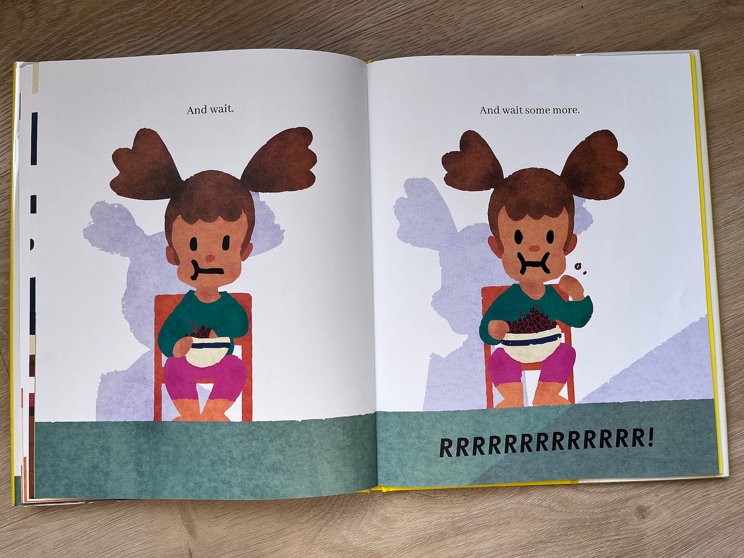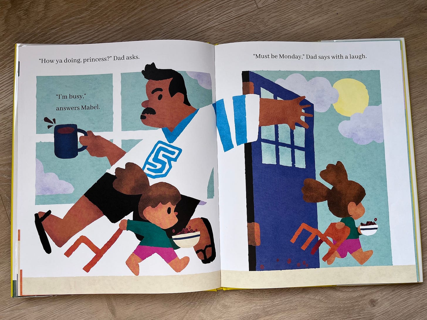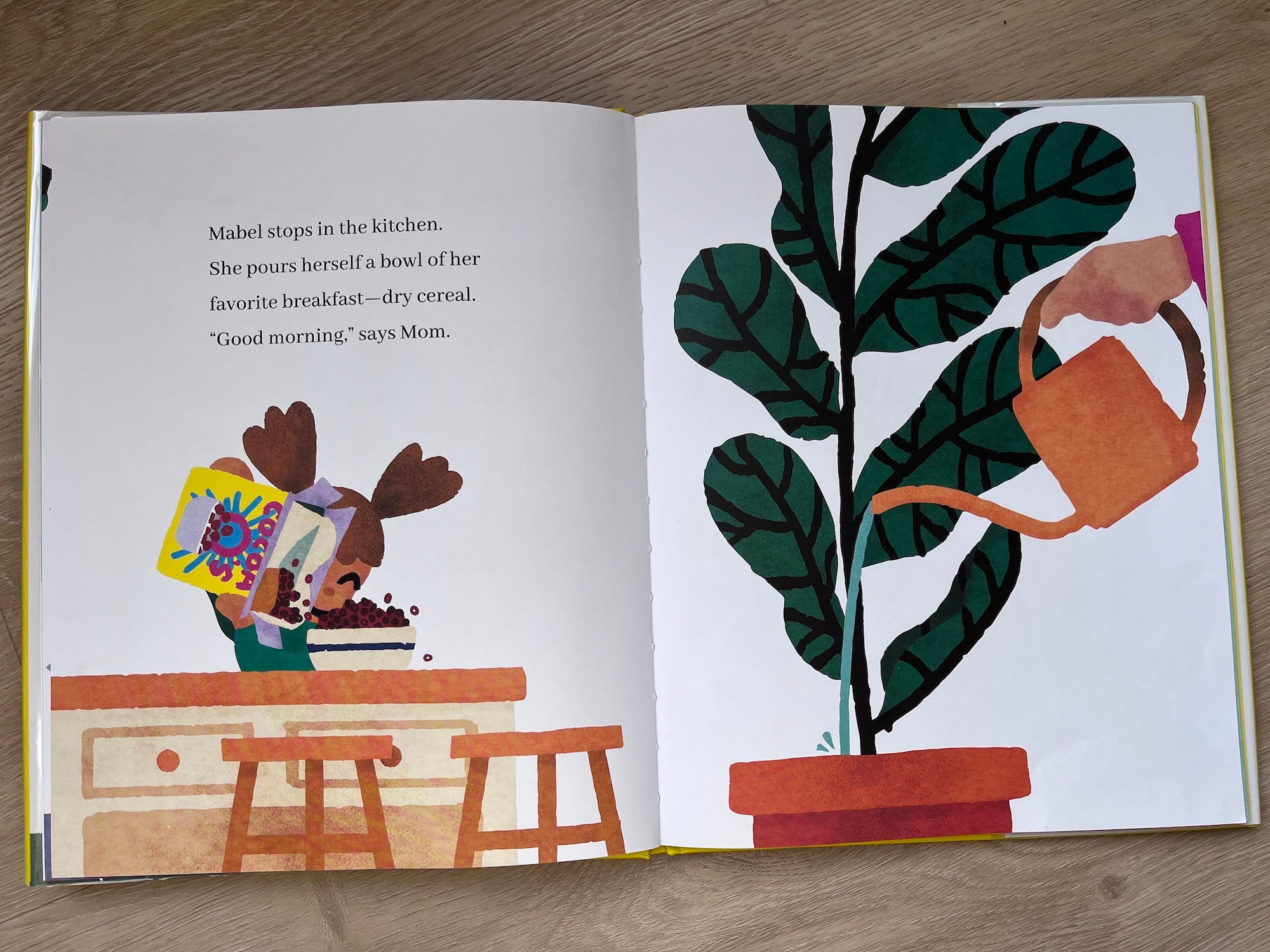 Mabel stops in the kitchen to get cereal. It’s spilling out of the bowl, further indicating that she’s in a hurry. Mom has her first line, but we only get a glimpse of her hand watering a plant. This spread does two things beautifully: