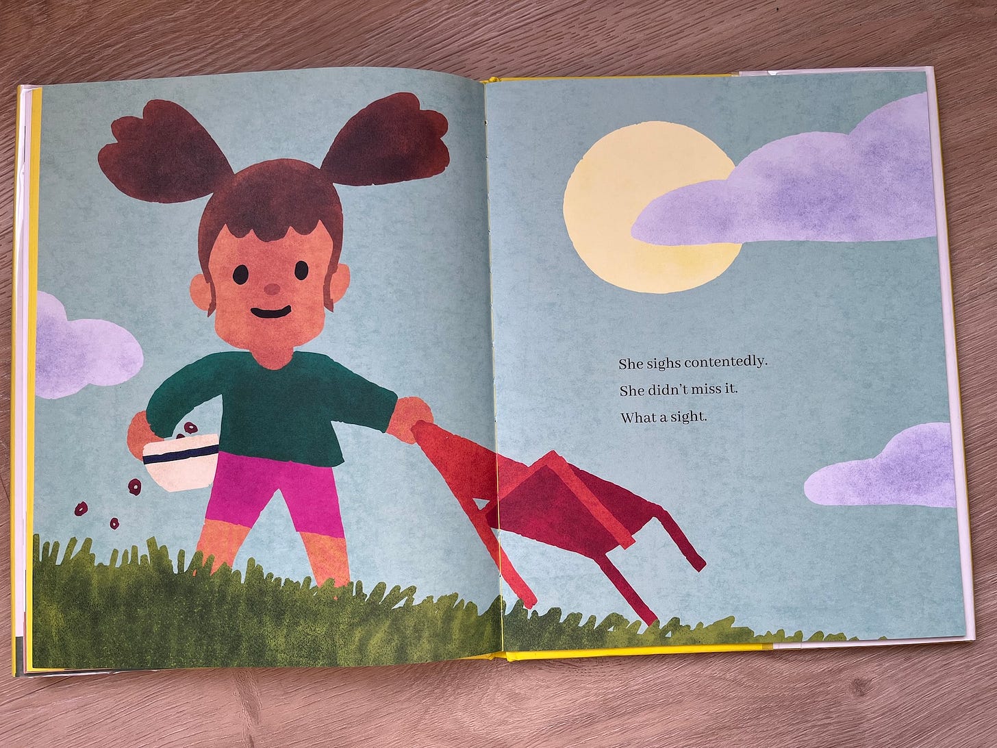 The background reappears, the ecstatic yellow of the previous spreads becoming a calming wash of blue as Mabel stands triumphant. The satisfaction is palpable. The delineation of mood is perfection.